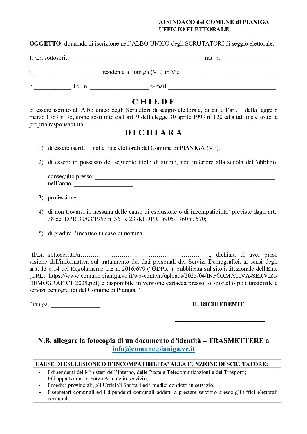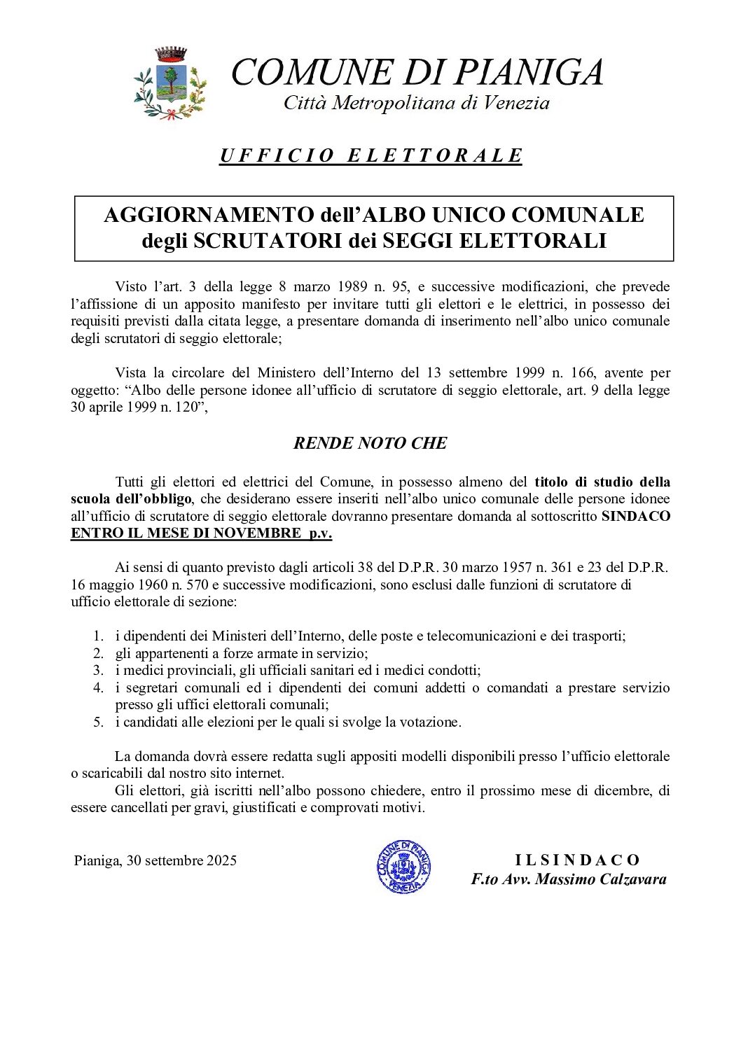 Tutti gli elettori e le elettrici del comune che desiderano essere iscritti nell’albo delle persone idonee all’ufficio di scrutatore di seggio elettorale, in possesso di un qualsiasi diploma di istruzione secondaria di primo o secondo grado, potranno presentare domanda entro il prossimo 30 novembre.