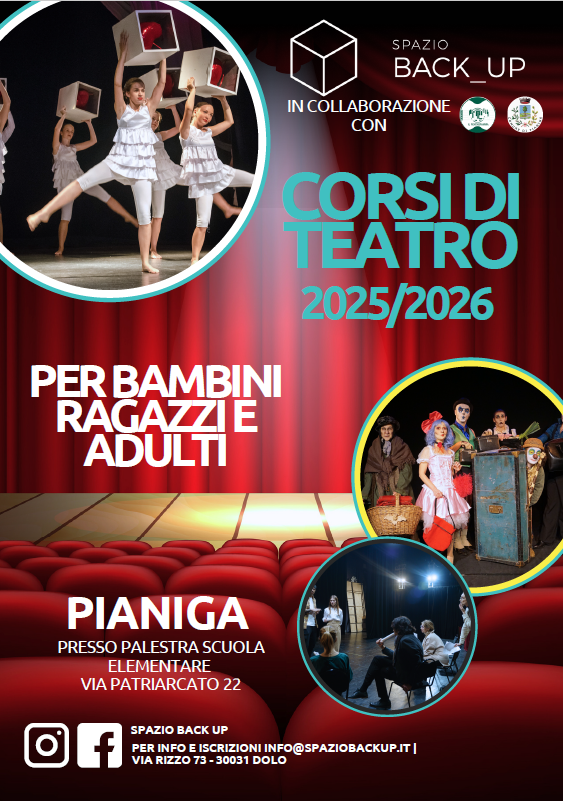 Spazio Back_Up, in collaborazione con l'Associazione Il Pentagramma e con il patrocinio del Comune di Pianiga, organizza i Corsi di Teatro 2025/2026 per bambini, ragazzi e adulti.