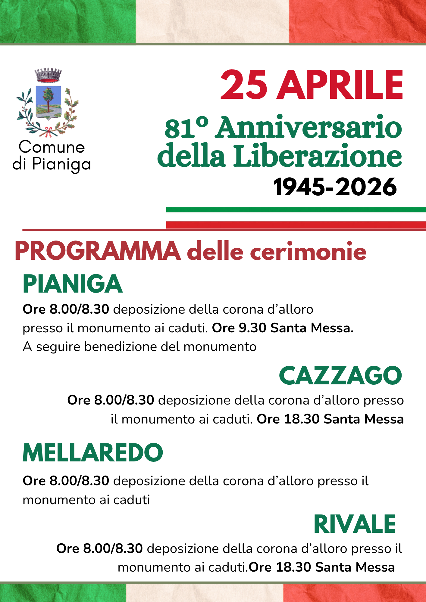 Una giornata per ricordare, onorare e trasmettere i valori di libertà, democrazia e pace. La comunità è invitata a partecipare alle cerimonie commemorative in programma: