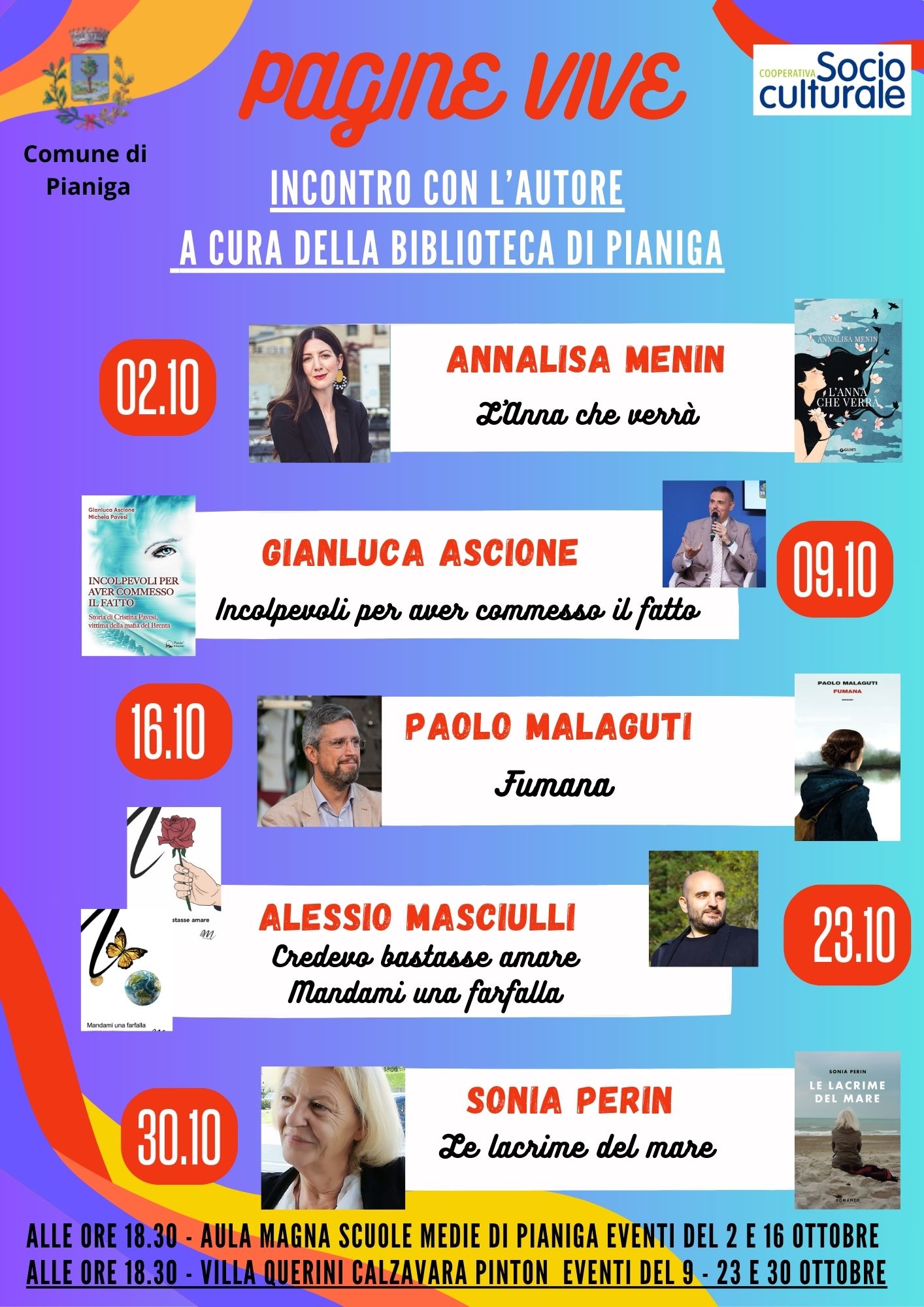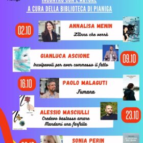 Anche per l'autunno 2025 la Biblioteca ha organizzato diversi incontri con Autori del nostro territorio alle ore 18:30 presso l'Aula magna dell'Istituto comprensivo "Giovanni XXIII" di Pianiga (eventi del 2 e 16 ottobre) e presso la biblioteca comunale (eventi del 9, 23 e 30 ottobre 2025).